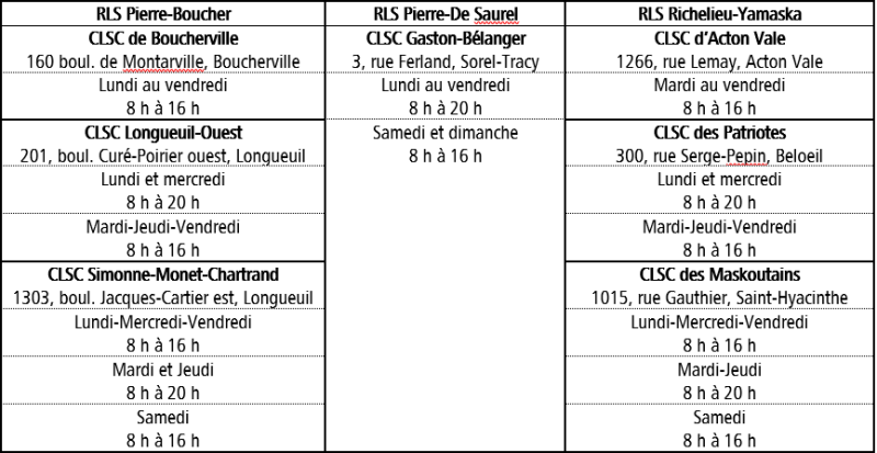 On retrouve également des services d’accueil, d’analyse, d’orientation et de référence en santé mentale en présentiel, avec et sans rendez-vous, dans un délai d’une heure ou moins, dans 7 CLSC du territoire de la Montérégie-Est selon l’horaire suivant :
