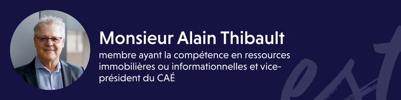 - Monsieur Alain Thibault, membre ayant la compétence en ressources immobilières ou informationnelles et vice-président du CAÉ