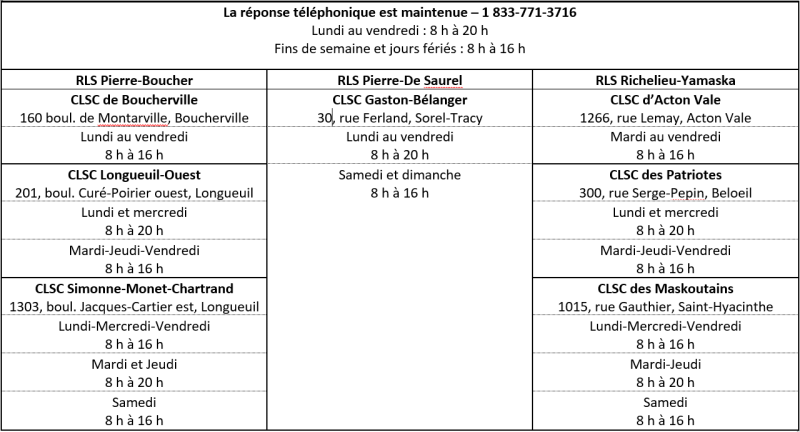 - On retrouve également des services d’accueil, d’analyse, d’orientation et de référence en santé mentale en présentiel, avec et sans rendez-vous, dans un délai d’une heure ou moins, dans 7 CLSC du territoire de la Montérégie-Est selon l’horaire suivant :